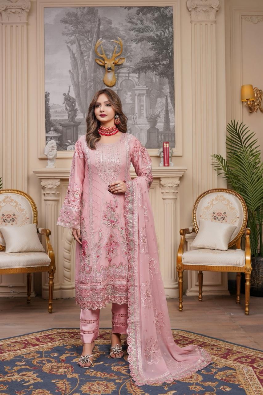 Includes: Embroidered Shirt, Silk Trouser, Fancy Dupatta