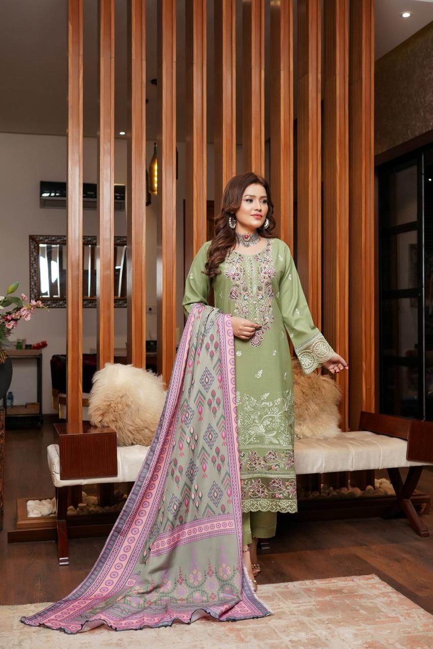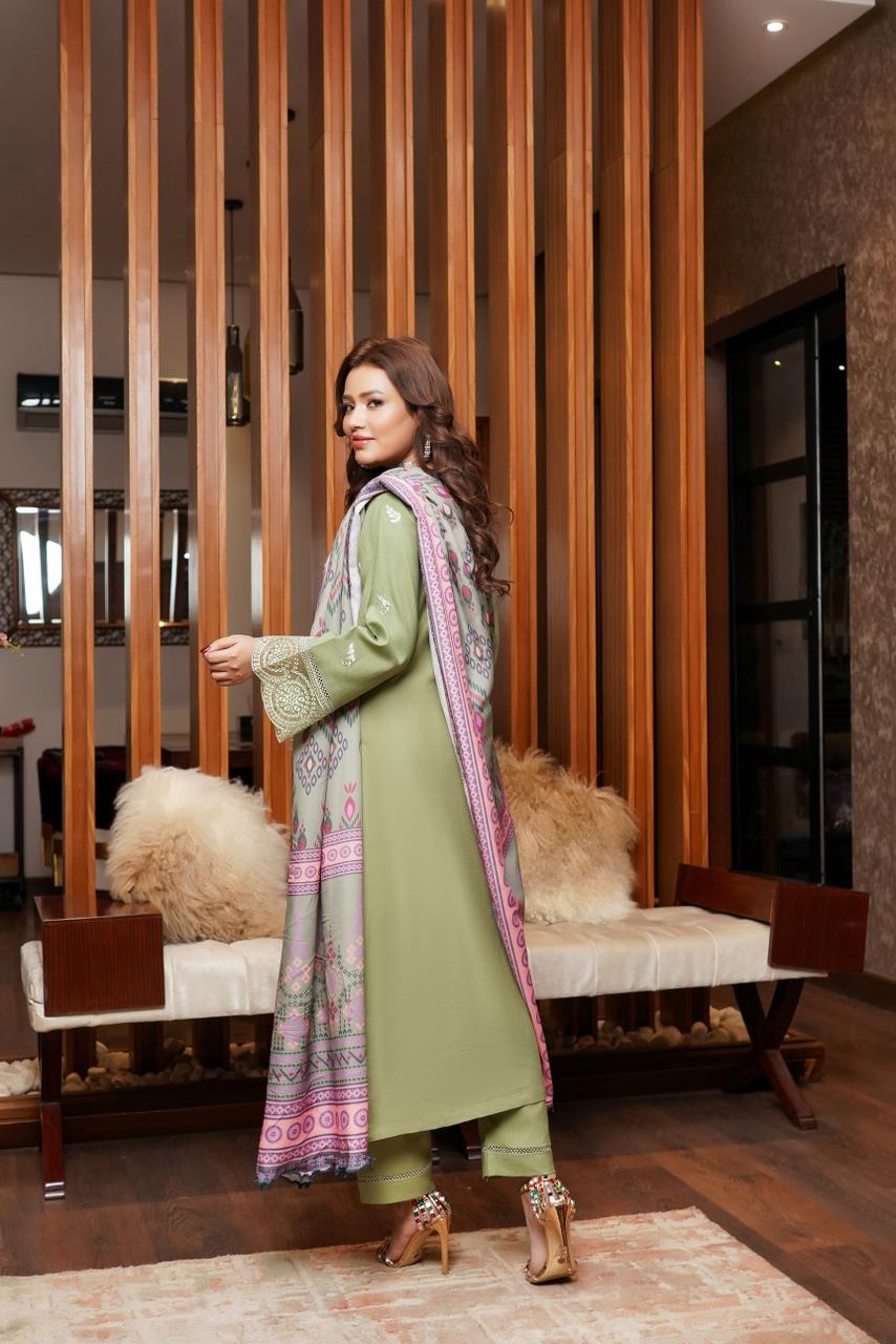 Includes: Embroidered Shirt, Plain Trouser, Printed Wool Shawl