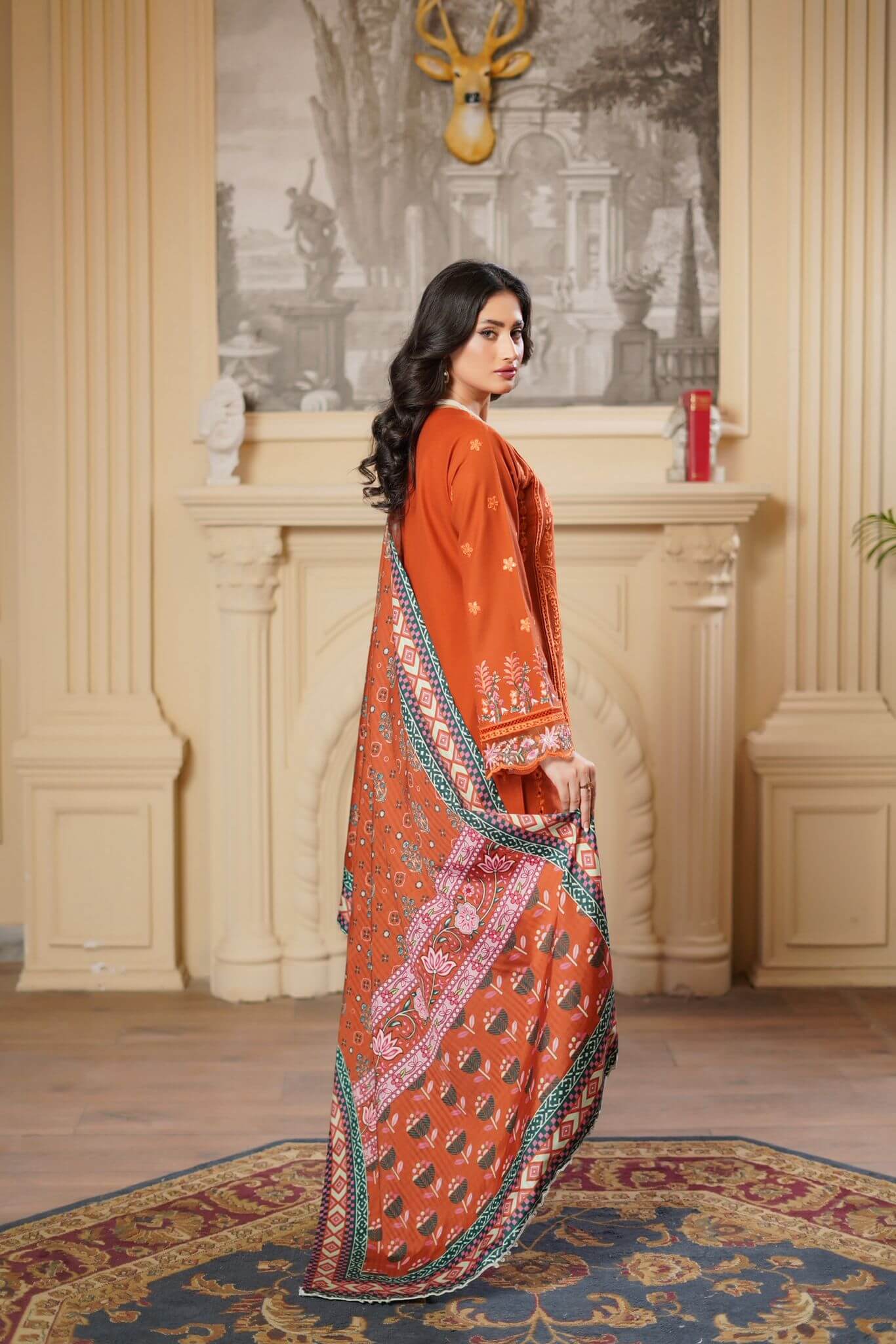 Elina blends comfort and class with its deep color palette and detailed embroidery. The luxurious fabric, combined with printed trousers and a matching shawl, makes it a standout choice for the modern woman.
