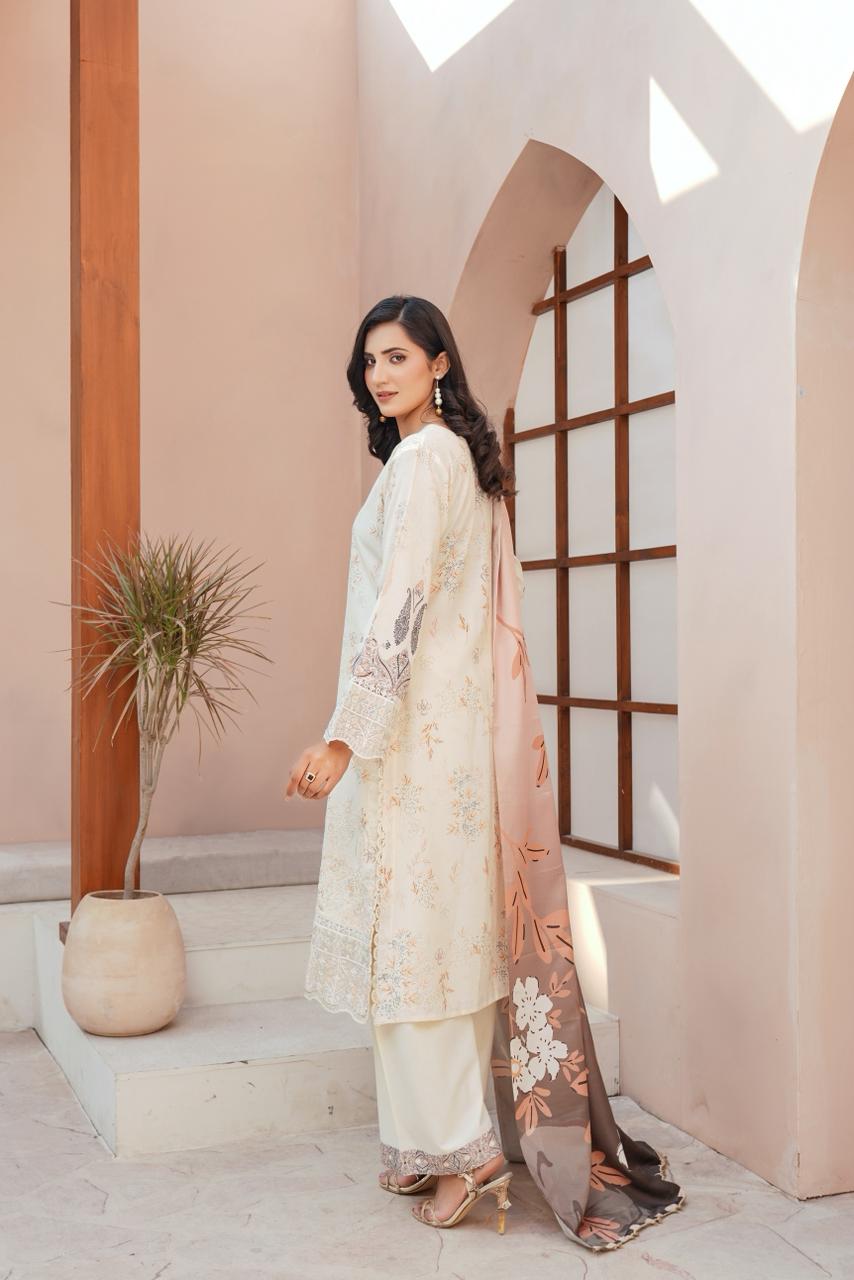 Eliza Winter Bloom is a graceful ready-to-wear outfit featuring refined digital prints enhanced with elegant embroidery. Designed with detailed patch and boring work across the neckline, sleeves, and borders, this ensemble offers effortless winter sophistication paired with a printed wool shawl.