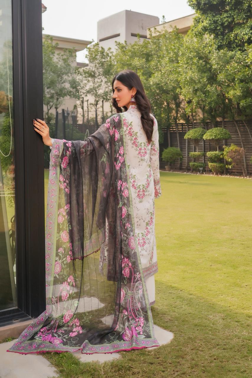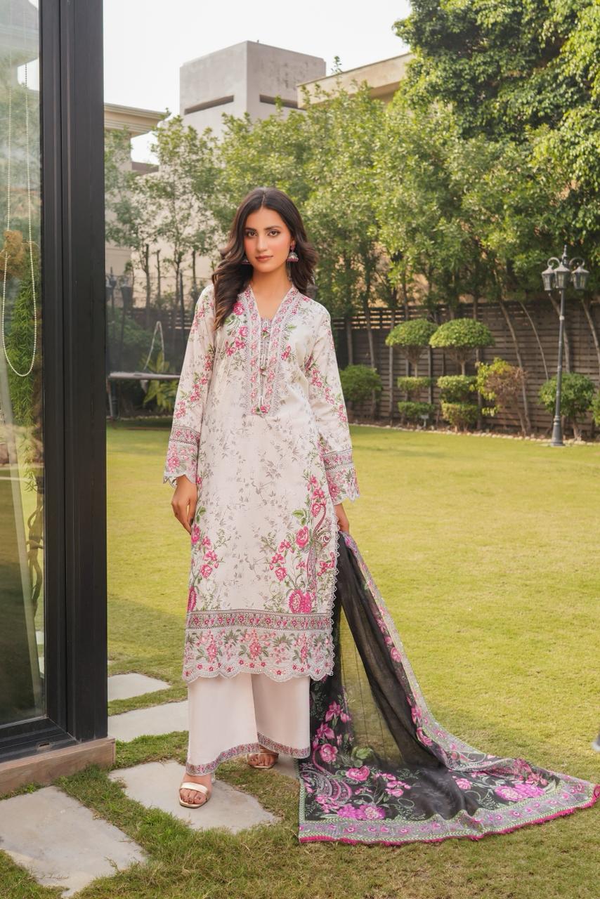 Laraib Elan blends delicate floral artistry with soft lawn textures, delivering effortless charm with subtle embroidery accents.