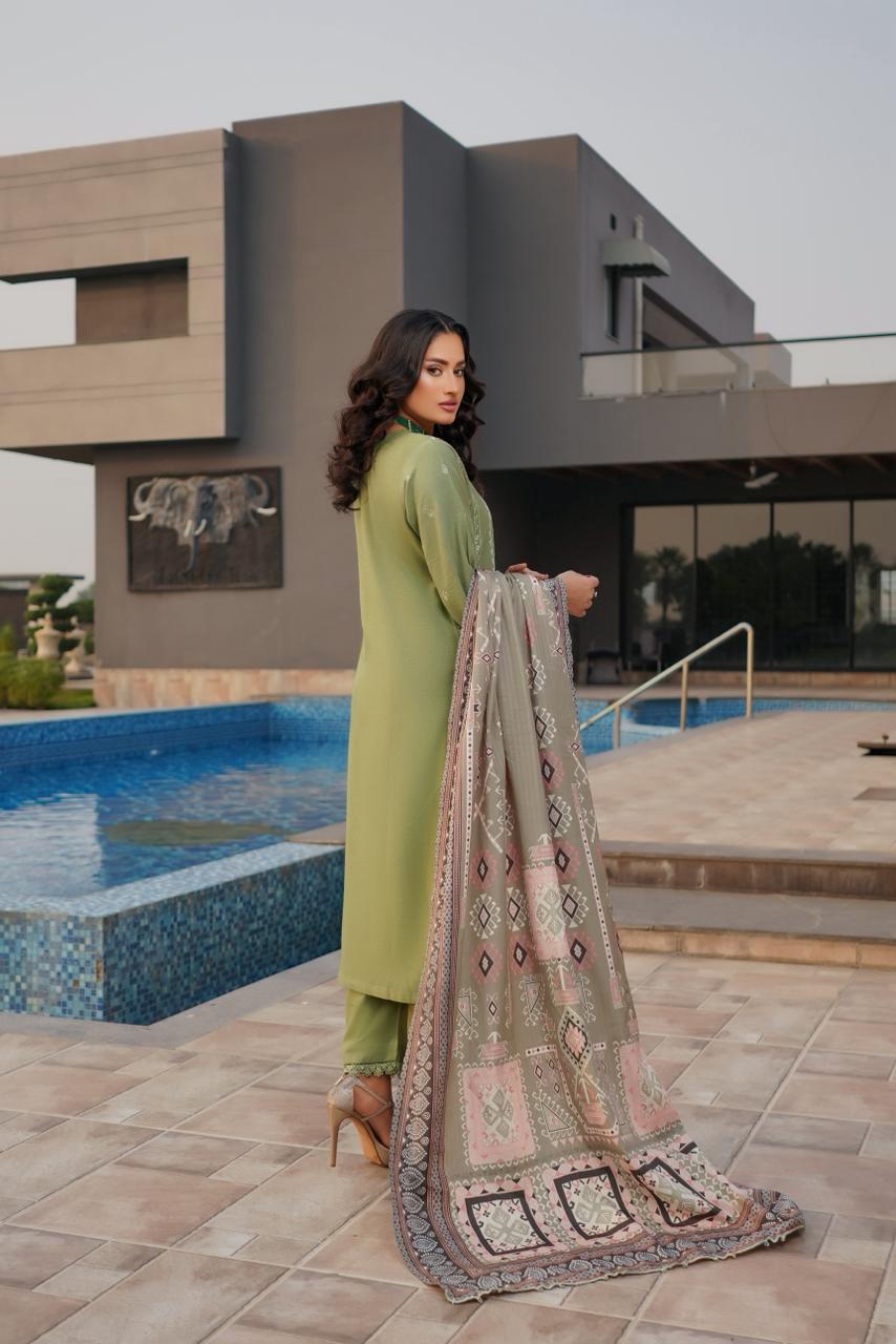 Mahira is an ode to winter grace—soft, majestic, and beautifully embroidered. Designed on premium Dhanak fabric, this ensemble features a delicately embellished front panel and floral embroidery that radiates sophistication. The long-length shirt paired with plain trousers ensures effortless charm, while the printed wool shawl adds warm seasonal refinement.