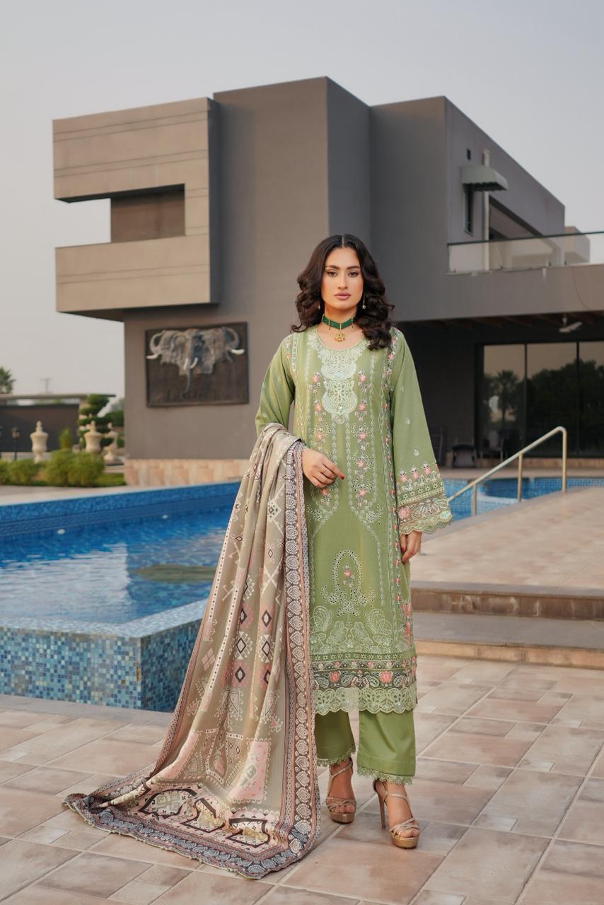Includes: Heavy Embroidered Front Shirt, Plain Trouser, Printed Wool Shawl