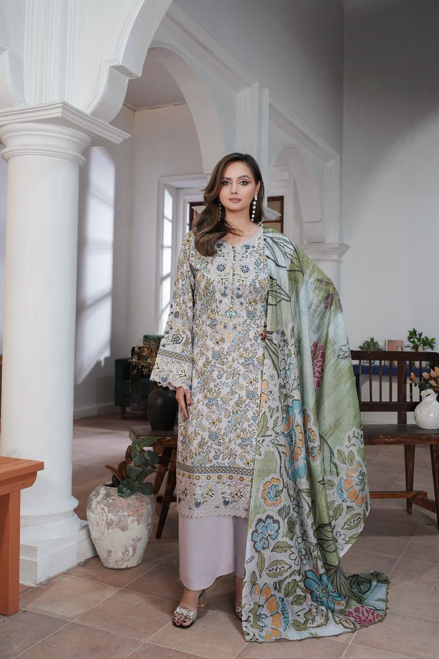 Includes: Digital Printed Shirt with Embroidery, Matching Bottoms, Printed Munaar Dupatta