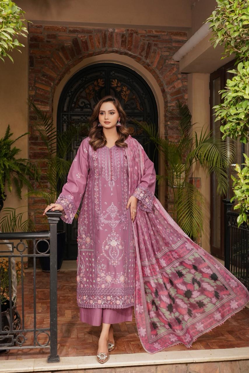 Aroosa blends traditional charm with modern refinement. Featuring a floral embroidered front and a soft printed Munaar dupatta, this design is both graceful and comfortable.