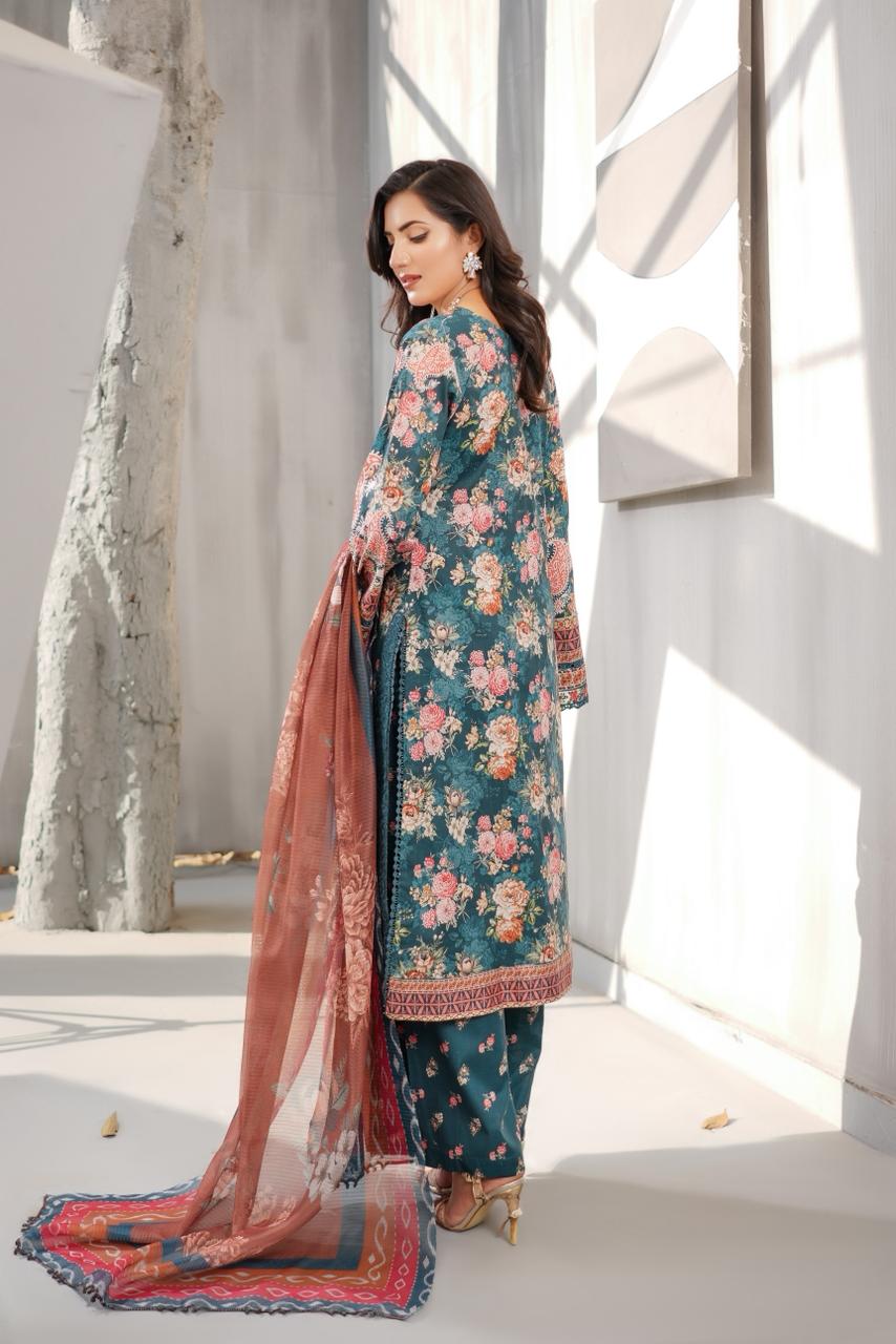 Rania Floral Elegance showcases richer tones and vibrant digital prints enhanced with fine embroidery. This ensemble reflects effortless charm, ideal for staying stylish while remaining comfortable in warmer weather.